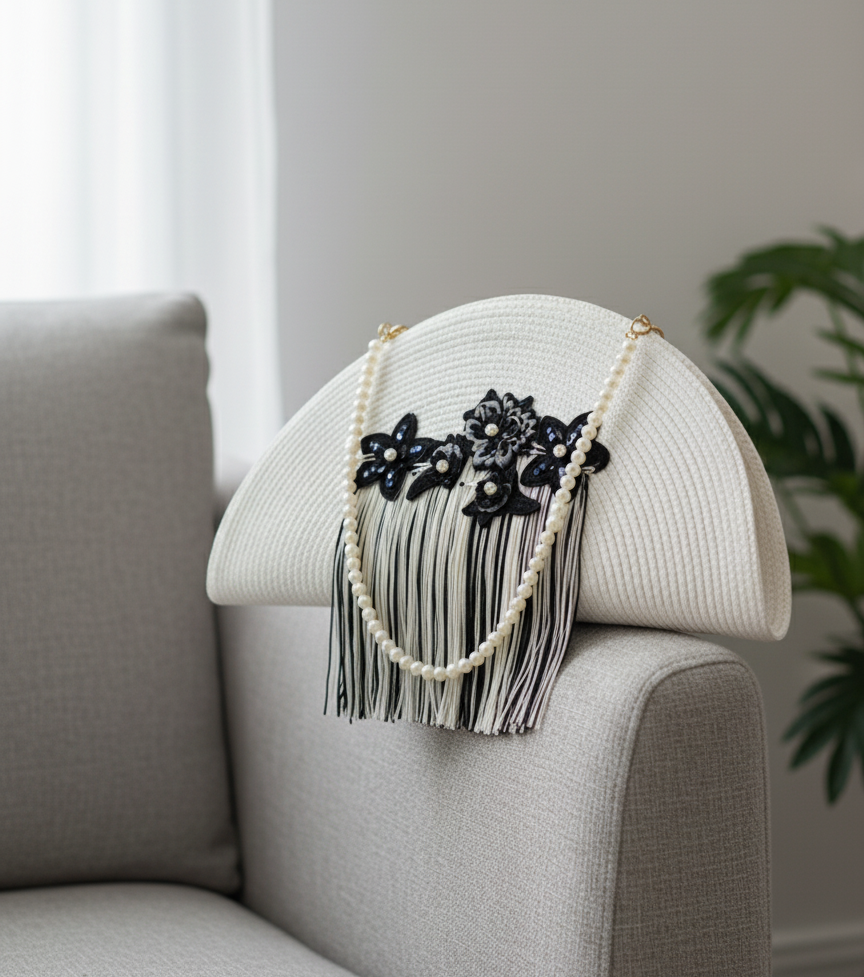 Elaborada en blanco y decorada con flores bordadas y flecos. Cierre de alamar con cadena de perlas. Medida 38cm